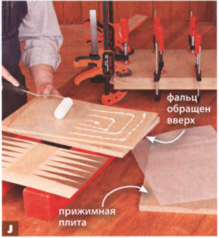 Нанесите тонкий слой клея на основу. Для равномерного распределения прижимного давления используйте достаточное количество струбцин.