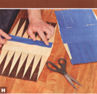 Поставьте новые метки: 32 мм на торце и 165 мм на стороне пакета, опилите пакет шпона. Какие же нарды без орнамента. Возьмите полоску шпона, она необходима для выравнивания рисунка. Соберите квадрат поля и масляным скотчем приклейте поочередно светлые и темные треугольники.