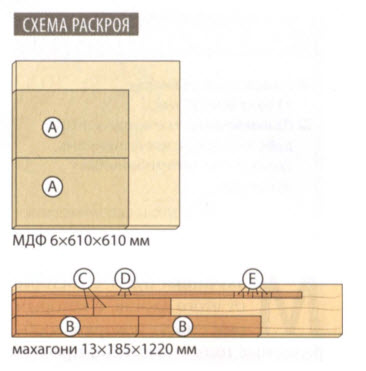 Подготовьте две основы А для игровых полей, выпилив их из МДФ толщиной 6 мм, четыре прижимные плиты из МДФ толщиной 19 мм и лва куска шпона махагони размерами 255×432 мм. Равномерно нанесите на основу белый клей ПВА и положите сверху лист шпона. Накройте шпон листом вощеной бумаги и сожмите пакет струбцинами между двумя плитами МДФ толщиной 19 мм. Когда клей высохнет, удалите струбцины и наклейте шпон на вторую основу для игрового поля.