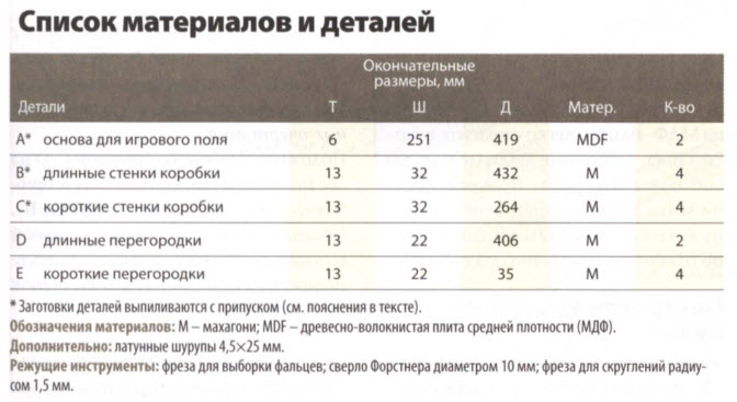 Закрепите фрезу 6 мм в станке. Отфрезеруйте все стороны. Наклейте игровое поле. Настройте пильный станок шириной в 32 мм и разделите коробку на две части, выпилите 2 перегородки. Проделайте то же самое для коротких перегородок. Сделайте на одной половине заготовку для петель и просверлите 4 дырочки диаметром 1 см. Тщательно отшлифуйте все заготовки и покройте лаком.