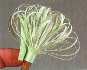 Длинную полоску зеленой бумаги нужно будет обмотать вокруг палочки для шашлычков. Но предварительно нужно сделать много надрезов по всей длине, не доходя до края 1 сантиметр.