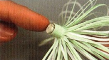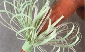 - Неразрезанный край прямоугольника свернуть в тугую трубочку, зафиксировать свободный кончик клеем. Распушить пальцами полоски-тычинки;