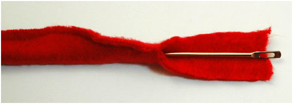 - Приступить к сшиванию двух частей подвески Деда Мороза, оставив небольшое отверстие для наполнения синтепоном.