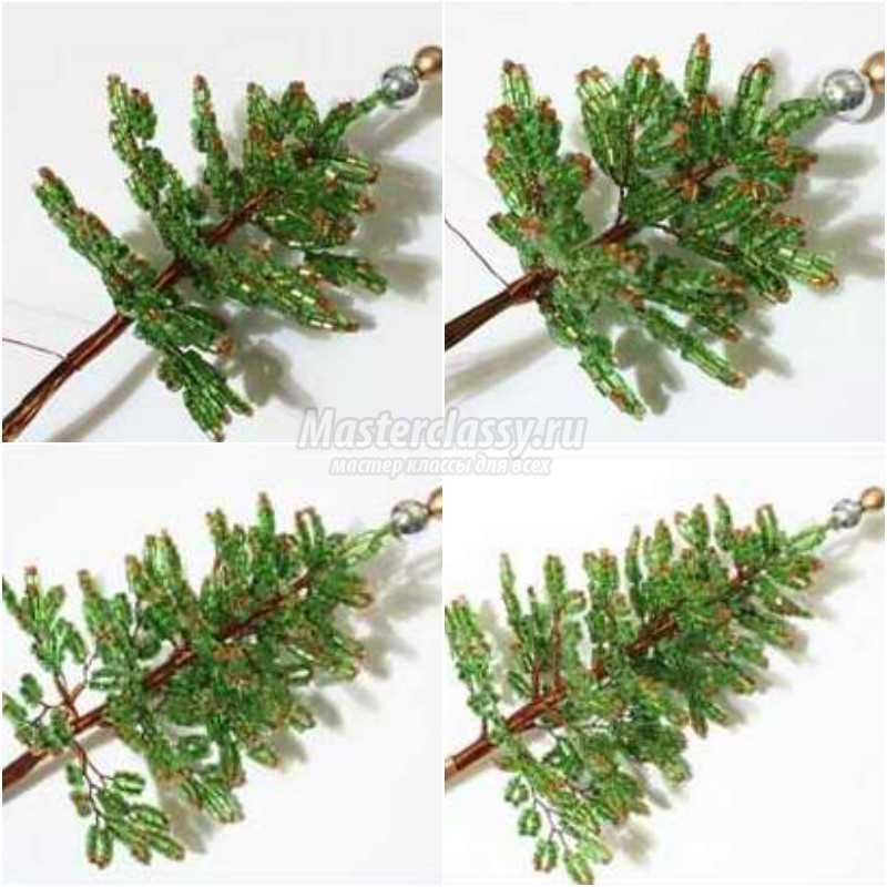 Таких веток делают 15 — 20 штук, смотря какой высоты будет ваша ёлка. На каждую нижнюю ветку добавляем по 2 зелёные бисерины, для придания пышности.