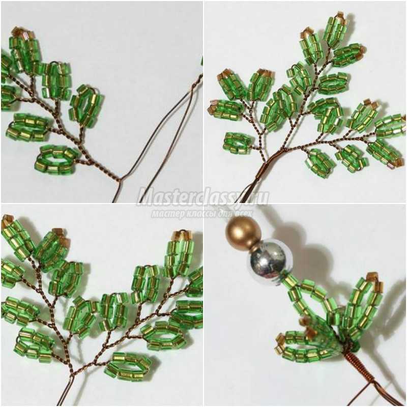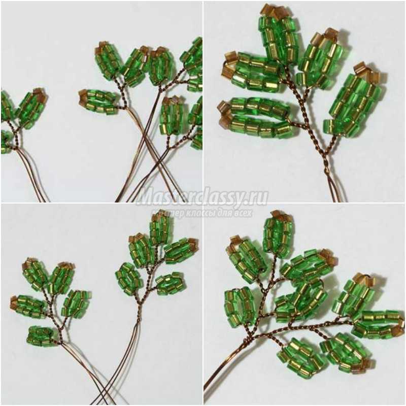 Следом за этим необходимо сплести восемь веток с использованием бисеринок салатового цвета, нанизанных на проволоку, общей длинной в 20 сантиметров.