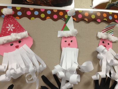 - Бороду мастерят из белого листа, порезанного на бахрому. На карандаш накручивают ее, чтоб стала кудрявой и приклеивают к голове.