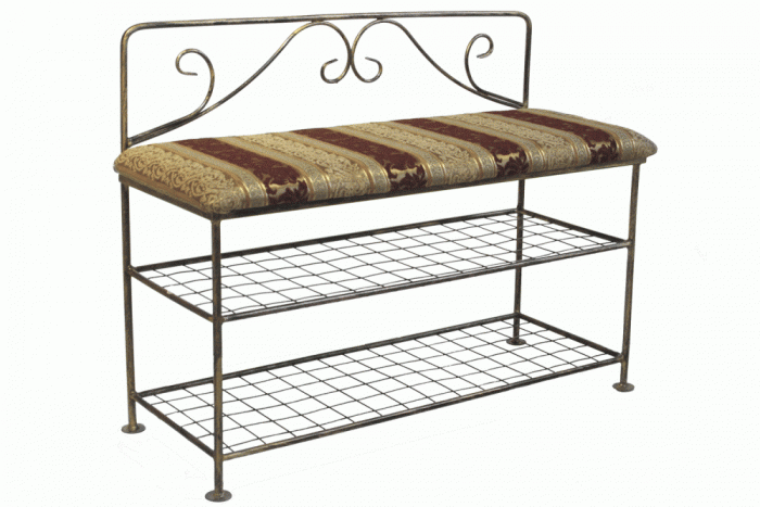 Внешней легкостью обладают конструкции, при изготовлении которых для поперечных полок использовались металлические элементы. Работа с таким эскизом предполагает наличие болгарки, лобзика по металлу и определенного опыта. Обладая навыками кузнечного ремесла, можно создать эксклюзивную модель полки для обуви с коваными элементами.
