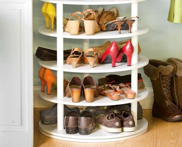 Нестандартные экземпляры полок также имеют два направления: форма и используемый материал. Достаточное пространство помещения позволяет установить круглую полку для обуви, удобству ее эксплуатации способствует вращающийся механизм. Наиболее сложным этапом будет выпиливание круглых заготовок и установка механизма, обеспечивающего мобильность устройства.