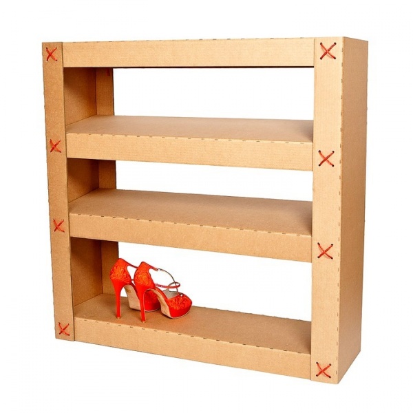 Представленная конструкция способна выдерживать большой вес, невзирая на то, что картон достаточно гибкий материал. Для ее изготовления желательно применять коробки от бытовой техники. В зависимости от высоты и ширины, берут необходимое количество коробок. Крепится конструкция на клей, скотч, степлером или иным способом. Готовую полку можно декорировать, как подскажет фантазия. Есть один недостаток – такая полочка пригодна лишь для летней обуви.