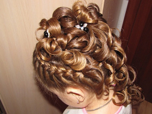 К примеру, вы можете вместе с ребенком, заранее перед праздником заплести косички из волос. В результате, распустив их, ваша малышка будет обрадована роскошным водопадом из кудряшек. Достаточно сколоть их в области макушки заколкой, и получится отличная модная прическа.