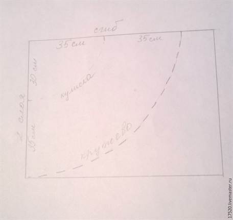 Выкройка очень простая, поэтому необязательно рисовать ее сначала на бумаге, можно наметить мелком прямо на ткани, кстати, удобней сложить ее пополам и скрепить булавками.