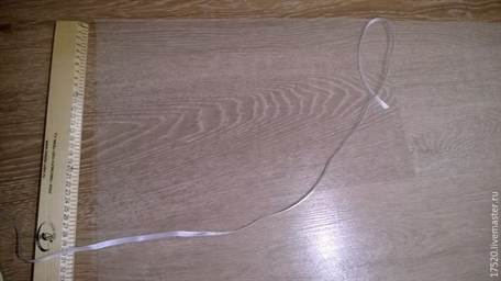 Поверх получившихся складочек аккуратно пришиваем красивую ленточку. Возьмите ленту подлиннее, чтобы завязывать красивый бант.