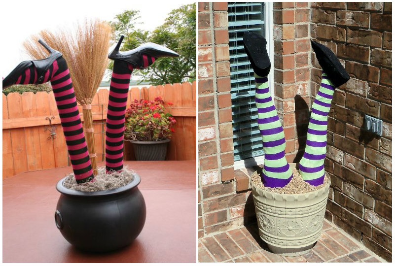 Отличной идеей декора могут стать «ведьмины ноги». Для них потребуется старая пара обуви, а также толстые колготки. Необходимо наполнить колготки и всунуть «стопами» в башмаки. Потом их можно спрятать под кровать, стол или стул, чтобы они «выглядывали».