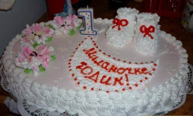 Хорошо смотрится, для совсем маленьких, торт, на котором кремом нарисовано какое-нибудь транспортное средство.
