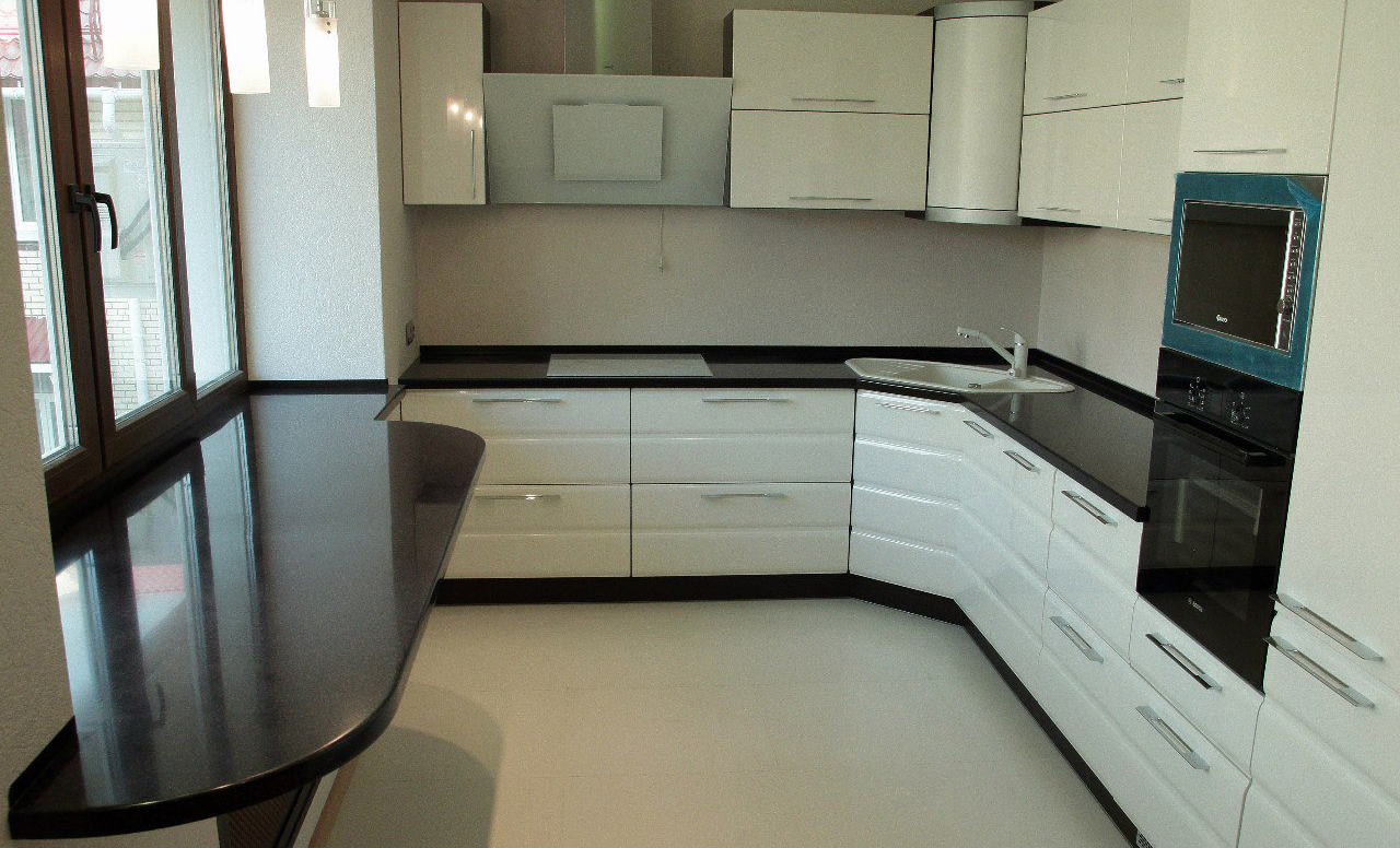 На заметку! В больших помещениях квадратной или П-образной формы очень эффектно смотрятся полукруглые или прямоугольные столешницы, охватывающие поверхность сразу трех стен.