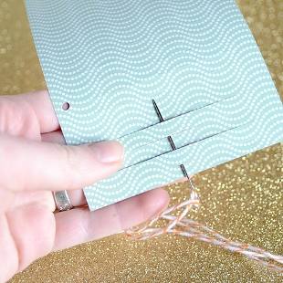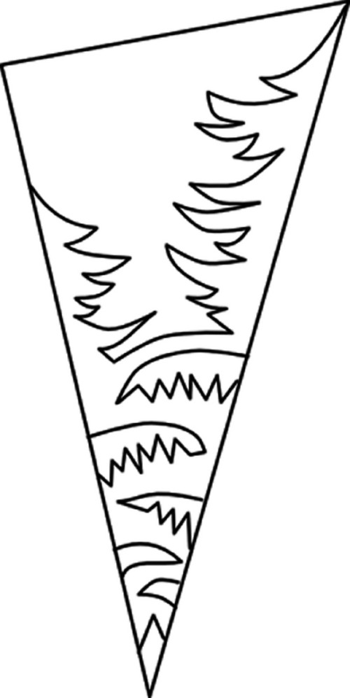 По краям поделки пробейте дыроколом отверстия и окрасьте ваше изделие белой краской из балончика. Ствол деревца сделайте шириной 5 см. Потом протяните белую шерстяную нить или шнур через дырочки, сделанные ранее. Чтобы «сшивать» было удобнее, возьмите иглу с большим ушком. Сбрызните звезду белой краской и прикрепите на верхушке с помощью клея. Украсьте все изделие блестками. Для этого можно использовать золотистый дождик, ёлочные игрушки или разноцветную бумагу, приклеенную по бокам елки.