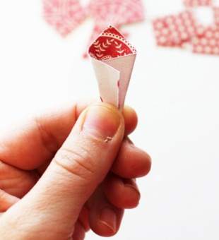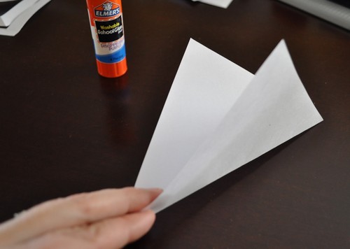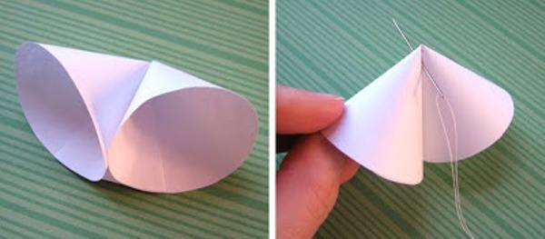 По такой же схеме сложите остальные пять заготовок. Соедините три части снежинки степлером посередине. Оставшиеся три части скрепите аналогичным образом. Теперь склейте эти две половинки вместе. Чтобы форма держалась, осталось соединить снежинку там, где каждая из шести частей соприкасается с соседней. Украшение можно изготовить из бумаги любого цвета.