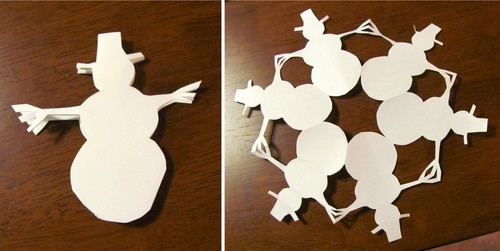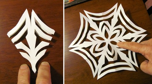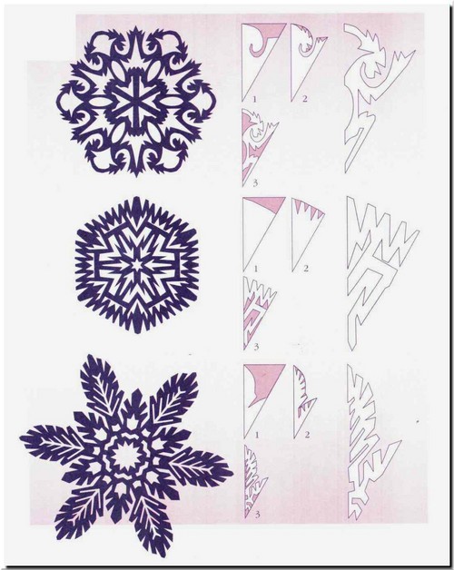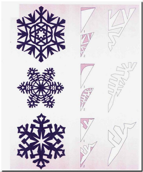 Еще в советское время на уроках труда делали снежинки из цветной бумаги путем вырезания различных узоров. Схем таких узоров – и сложных, и простых – очень много, поэтому и вариантов снежинок всегда было множество. Вот только некоторые из них, но при желании в интернете найдете еще с десяток разных вариантов вырезалок.