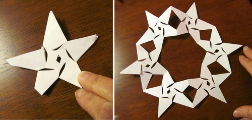 А если бумагу согнуть и разрезать таким вот интересным способом, а потом заготовку сомкнуть в кольцо, то получится другой, не менее интересный вариант венка.