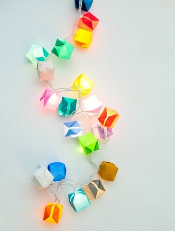 Сказочную атмосферу в доме создадут фонарики. Их можно сделать из цветной бумаги всего за несколько минут! Нарежьте ленты одинаковой длины и ширины (размеры зависит от величины будущего изделия). Чтобы смастерить один фонарик, заготовьте около 15 полосок бумаги. Затем сложите их в стопку и с помощью шила сделайте отверстия на обоих концах заготовок.