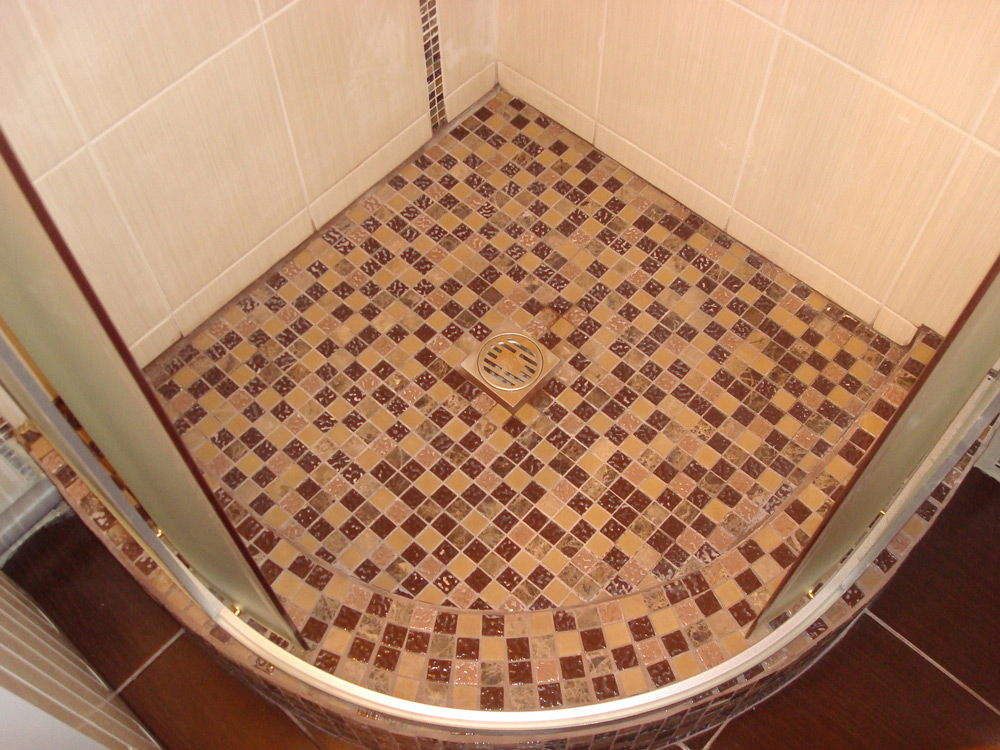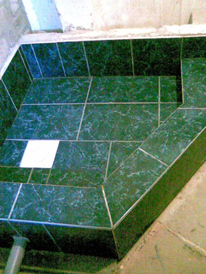 Облицовку наклеивают водостойкими составами. Перед тем, как сделать душевой поддон из плитки, нужно рассмотреть все варианты установки трапа. Выбирают такое положение защитной решетки, при котором ее можно аккуратно обойти и уменьшить количество резов отделочного материала. Стыки и примыкания тщательно заполняют акриловым герметиком. Для затирки швов применяют гидрофобные составы. По окончании укладки плитки на пол облицовывают стены, устанавливают перегородки или вешают шторки.