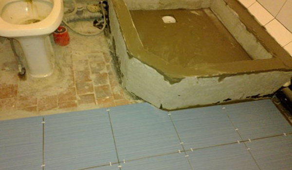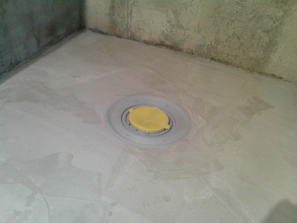 Для наиболее правильного устройства душевых помещений такого типа большое значение имеет горизонт поверхности пола, а также его гидроизоляция. Поэтому первым шагом будет выполнение стяжки на полу по маякам, если уровень не соблюден. Тщательная гидроизоляция стыков между полом и стенами поможет избежать возможных неприятностей в случае протечки по системе слива. Наиболее правильным решением будет использовать двухкомпонентную гидроизоляцию, нанесенную на стены и пол ванной комнаты в два слоя с выходом за габариты конечного изделия около 15 см.