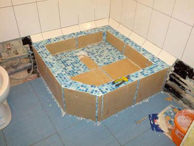 На финальном этапе работы все стыки промазывают сантехническим герметиком, руководствуясь общими правилами. Как и основание из пенобетона, пластиковый контур обкладывают кафельной плиткой или декоративной мозаикой. Если заранее наметить высоту пьедестала для душевой кабины, можно выбрать облицовку нужного размера и избежать неприятных следов обрезки.