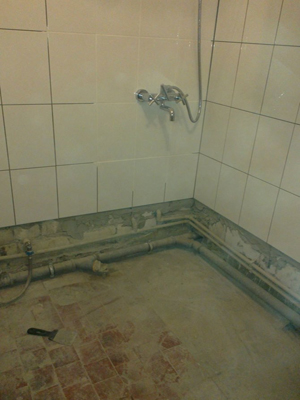 Если же вы решили делать выемку в полу, перед началом установки необходимо перфоратором удалить плитку (если такая имеется) на том месте, где планируется душевой поддон. Кирпичи следует уложить вдоль боковой стенки душа и укрепить их бетонным раствором.