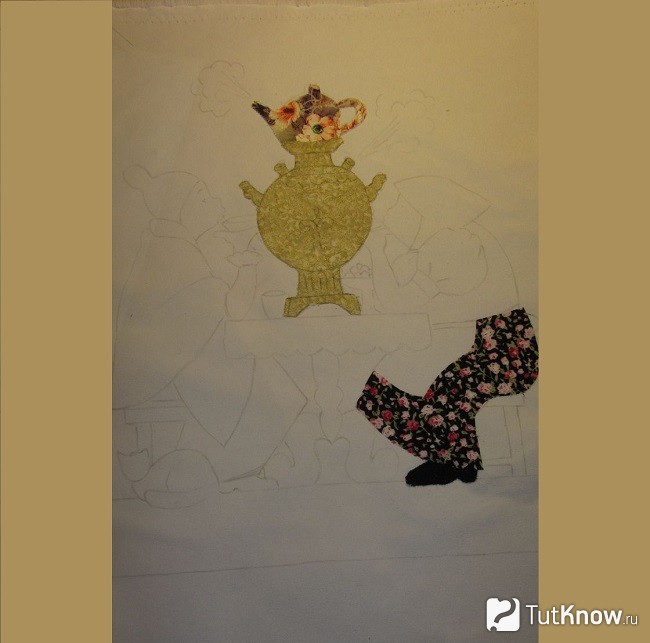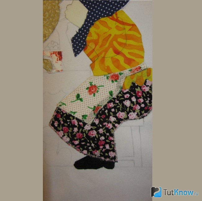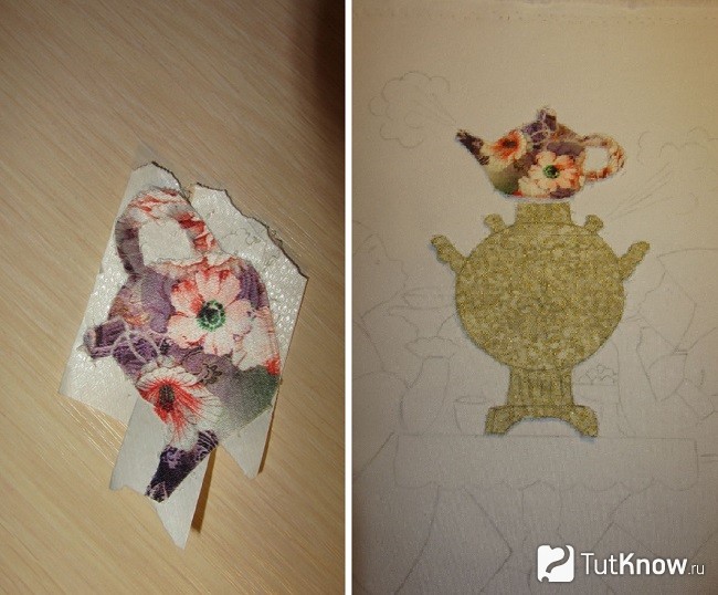 Затем выкраиваем необходимые элементы рисунка из другой ткани и прикрепляем их поверх фона. Это можно сделать удобным для вас способом, например, пришить или прикрепить утюгом.