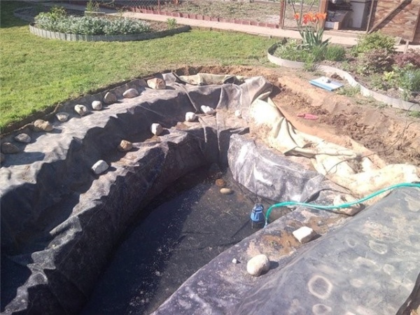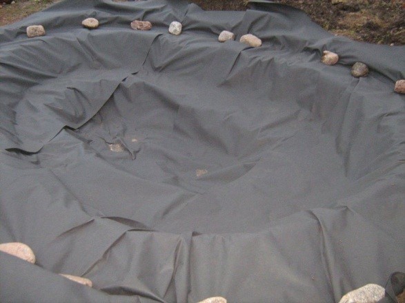 - Следующее что нужно сделать – это постелить пленку. Укладываем ее так, чтобы край выходил за яму. Затем прижимаем пленку камнями по контуру пруда.