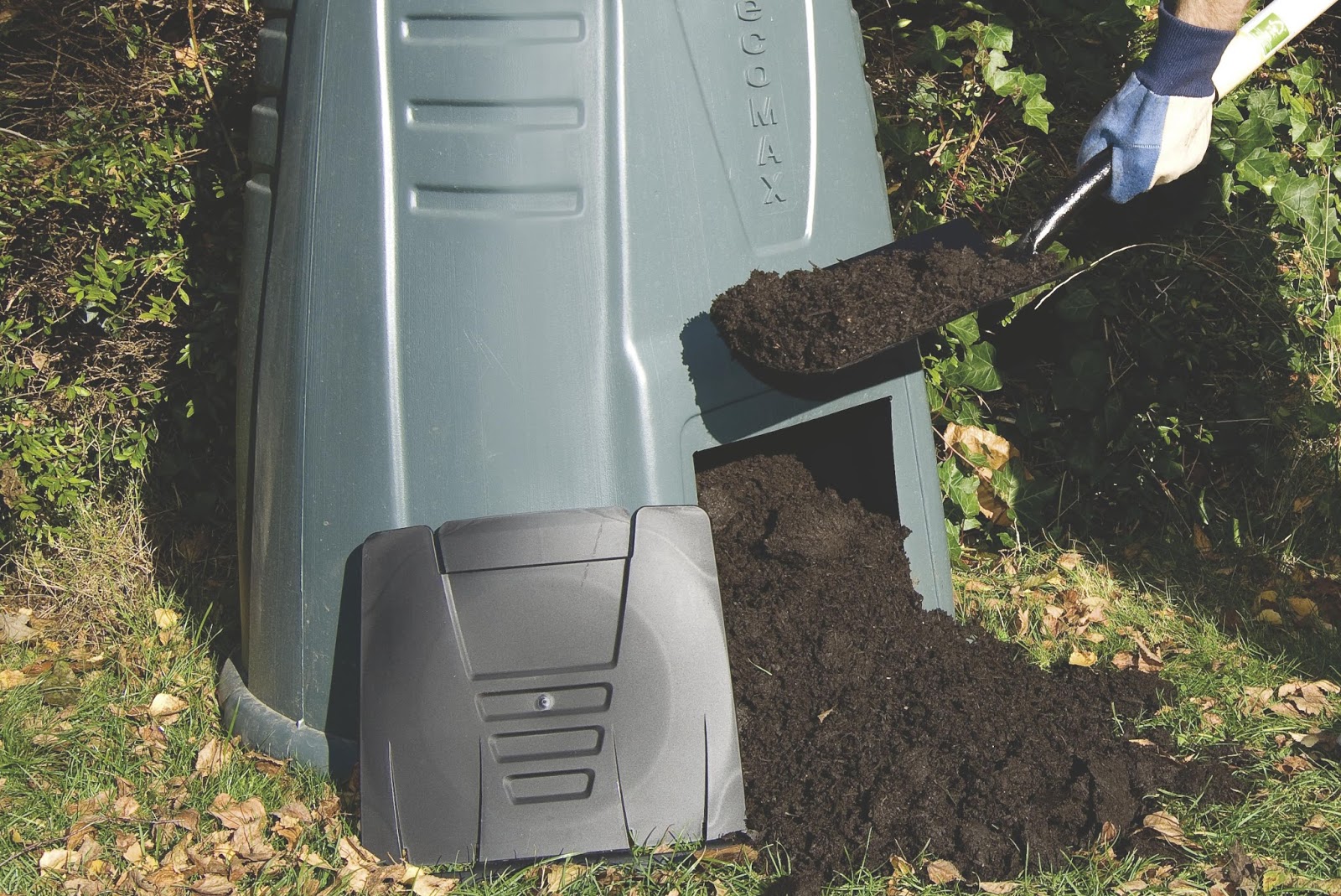 Контейнер имеет сбоку дверцу, чтобы доставать компост.