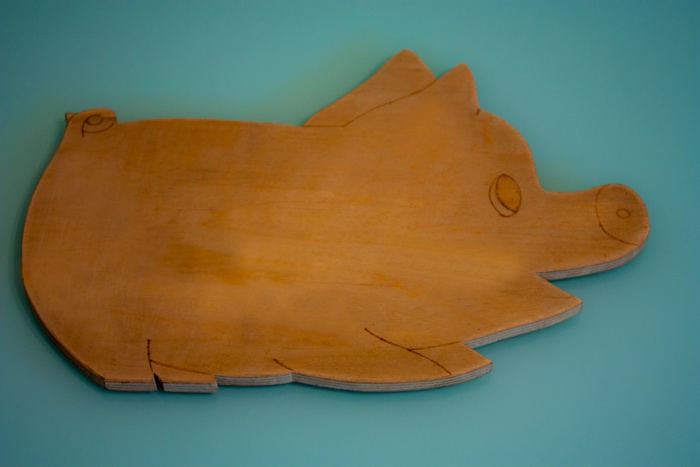 малярным скотчем и нанесите на все детали копилки бесцветное покрытие. (Мы три раза распыляли полуматовый нитролак из аэрозольного баллона с промежуточной шлифовкой наждачной бумагой № 320.)