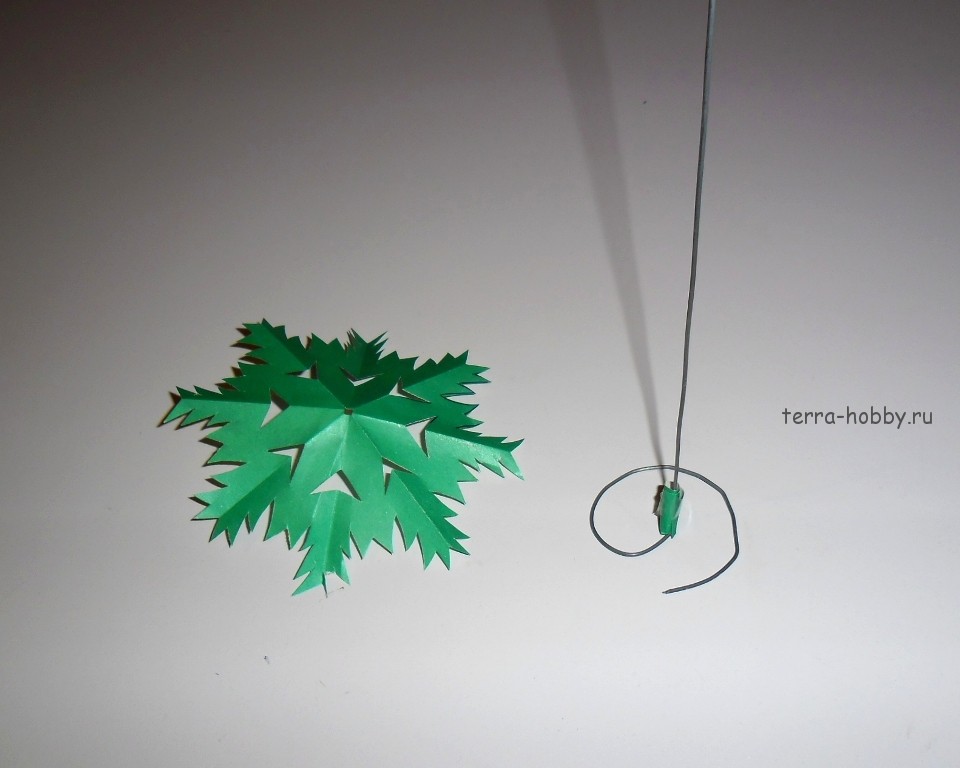 Для следующей объемной поделки понадобятся шаблоны, распечатанные на зеленой бумаге. Вырезаем их и сгибаем все линии. Складываем пирамиду и надежно склеиваем края. Помещаем их друг на друга. Ниже вставляем втулку, которая послужит стволом. Украшаем изделие любыми украшениями.