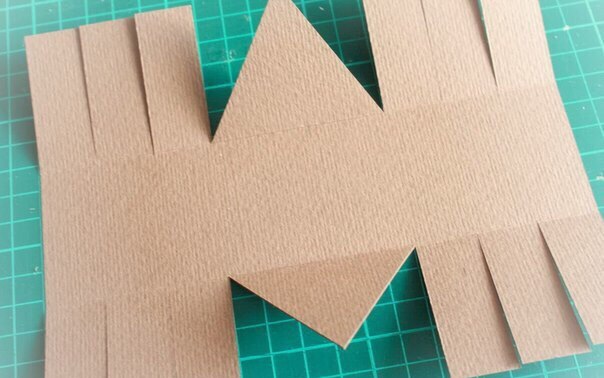 Сгибаем заготовку так, чтобы два противоположных квадрата по средней линии встали параллельно друг другу. Оставшиеся боковые стенки будут наклонены под одинаковым углом.