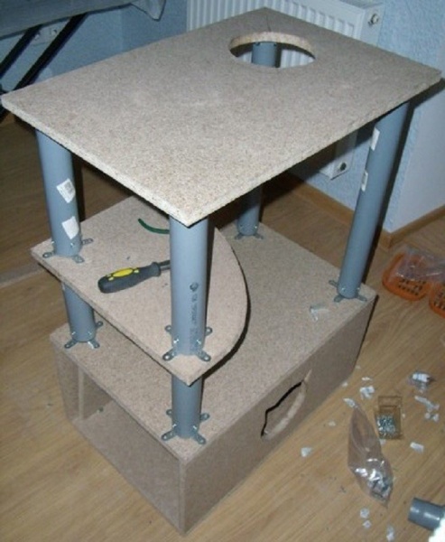 Чертим план будущего жилища, оно может быть простым или же многоуровневым. В соответствии с планом распиливаем плиту ДСП на части. Обиваем все секции ковролином. В основании, где спит кошка, подкладываем под ковролин поролон. Если конструкция многоярусная, делаем это под каждой верхней полкой, где сидит кот.