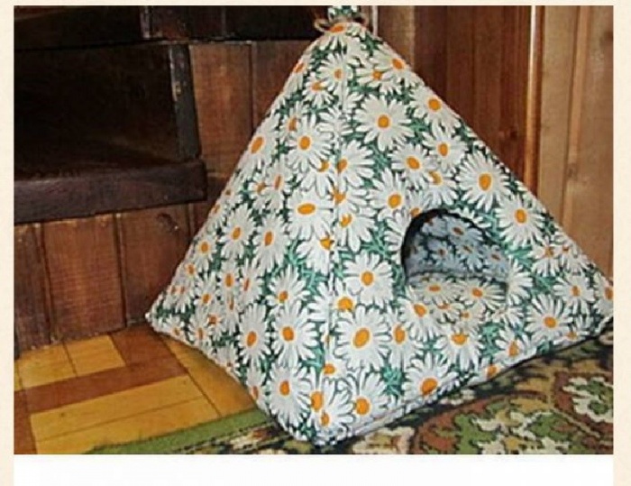В картоне или фанере проделайте отверстия по углам, в которые нужно вставить проволоку крест-накрест. В итоге должен получиться каркас, похожий на каркас палатки. На дно кладём подушку (из натуральных материалов, не забываем), по размером чуть меньшую основания. И финальным этапом станет обтягивание майкой. Берём обычную майку, из горловины делаем вход, низ выводим под основание, а отверстия для рук закладываем и фиксируем. В итоге получится простой домик-платка, в котором котику будет уютно и комфортно спать.
