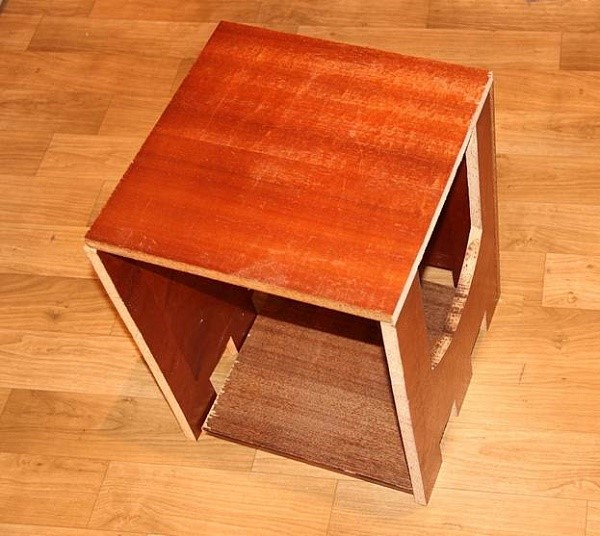 - Взять лист фанеры и сделать 3 боковые стороны домика, пол квадратной формы.