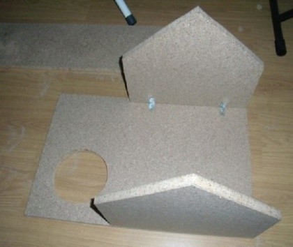 Делаем на доске разметку. С помощью дрели и лобзика вырезаем в верхней части пазы для совмещения досок. В нижней части боковых досок сверлим на расстоянии 9 см от края два отверстия. Основание закрепляем между досками при помощи саморезов. Домик можно украсить обивкой или покрыть лаком.