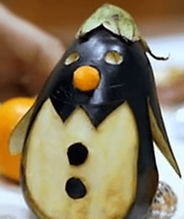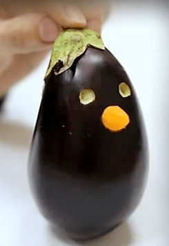 Можно одежку для поделок вырезаиь внутри другого овоща. Вот например комбинезончики на миньонах ниже – это половинки баклажанов, из которых достали всю мякость и внутрь вставили картофельные тела миньонов.