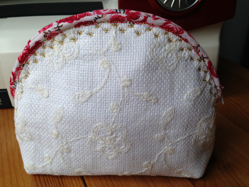 Чтобы украсить косметичку, строчки выполняем контрастными нитками.