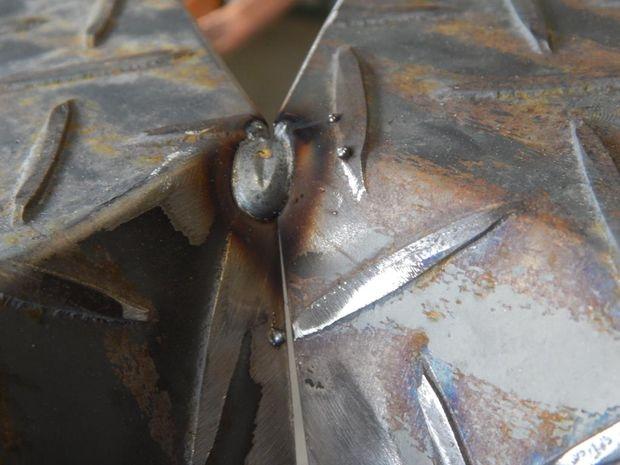 - Сделаем небольшие швы по всем границам лепестков. Затем сразу зачистим болгаркой (каменным диском) зазубрины, которые остались от резки, чтобы случайно не пораниться.