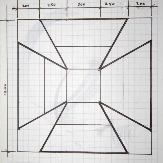 Идея стенда — безопасно поднять очаг для костра над уровнем земли. Стенд или рама состоит из двух квадратов; один — 700 мм х 700 мм, чтобы держать часть очага, а основание 900 мм x 900 мм. Между этими квадратами очень простая решетка, которая придает конструкции необходимую жесткость.