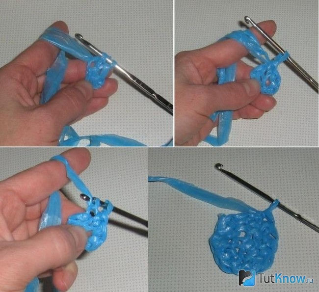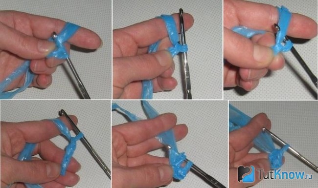 Затем разверните их. У вас получатся целлофановые кольца, которые нужно связать между собой. Для этого петельку одного накладываем на край другого, просовываем и затягиваем.