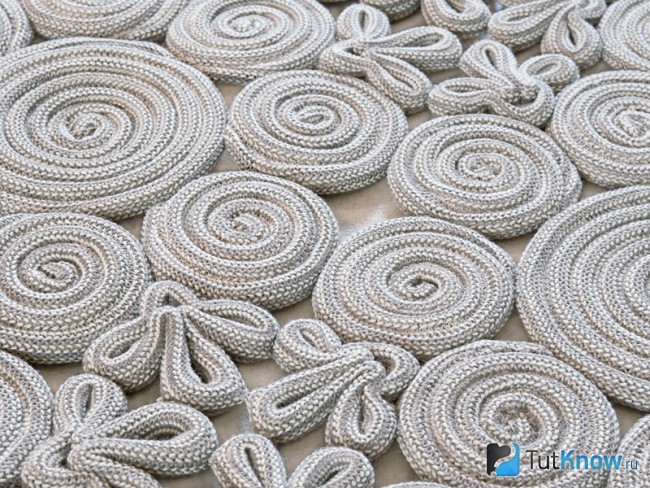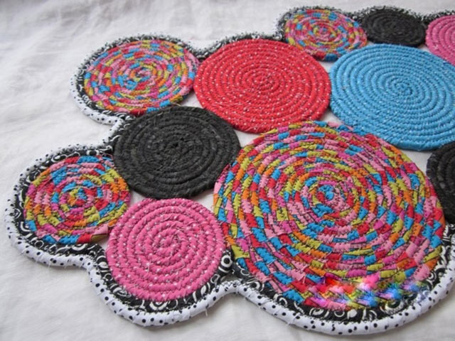А вот такой можно смастерить коврик из шнура. Для этого делается несколько заготовок разного размера. Шнур закручивается по спирали, и его фрагменты приклеиваются. Затем заготовки скрепляются при помощи клея между собой.