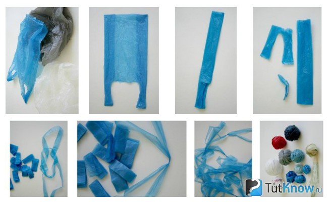 Теперь нужно смотать полученные нити в клубок, и можно начинать вязать коврик из пакетов.