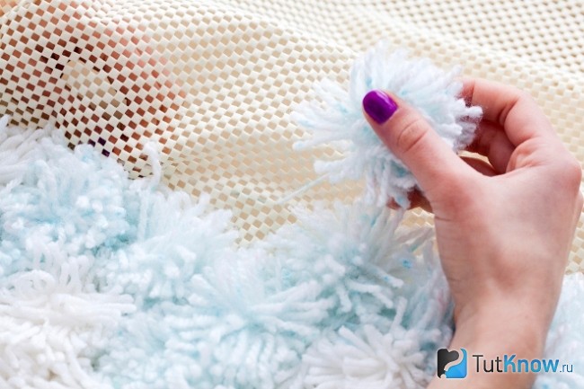 Начиная с угла, привязываем наши помпоны на основу. Для этого нужно просунуть нить между ячейками и завязать ее на узелке с изнанки. Чтобы закрепить помпон более надежно, можно протянуть нить несколько раз через рядом расположенные ячейки.