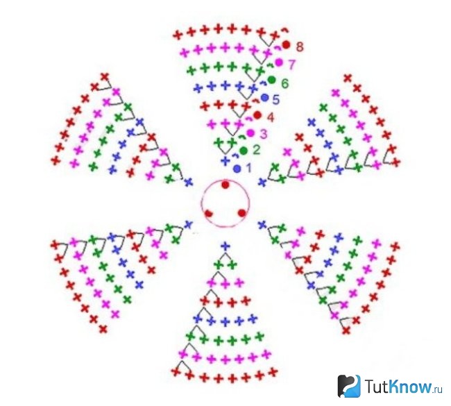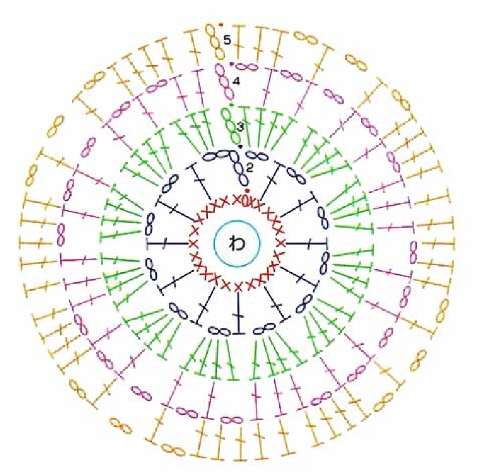 - Затем, согласно схеме для создания круга, свяжите 5 абсолютно одинаковых кругов столбиками с накидом, меняя цвет нити в рядах. Это займет основную часть времени.