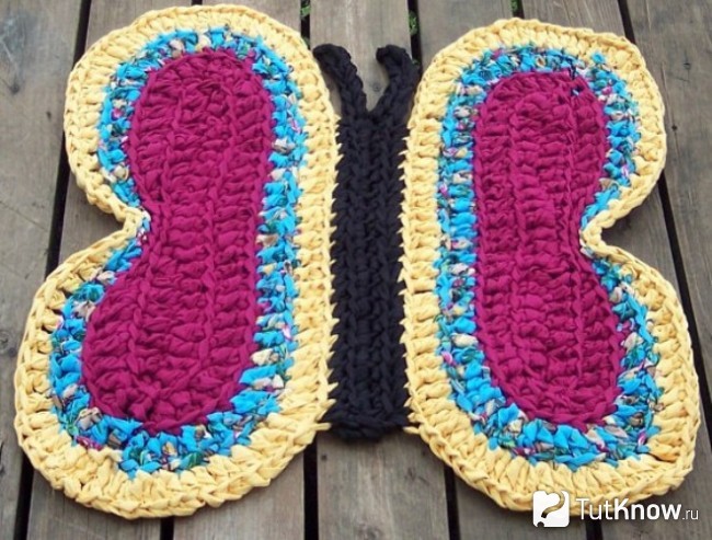 Если вы хотите, чтобы на полу красовалась вот такая бабочка, тогда начните вязать ковер с центра одного крыла, создав овальную фигуру. В данном случае она малинового цвета. Затем выполните окантовку голубой тканью. При вывязывании краев крыльев сделайте их вогнутыми с одной стороны, как это показано на фото. В данном случае для этого использовалась лента, нарезанная из желтого полотна.