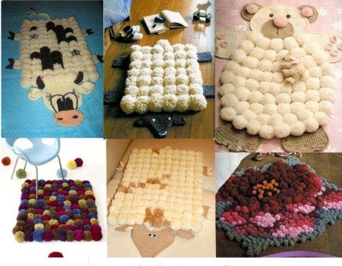 На фото вязаных ковриков можно заметить не только «скучные» взрослые модели. Встречаются забавные яркие и весёлые изделия. Для создания таких вариантов редко используют сложные схемы.