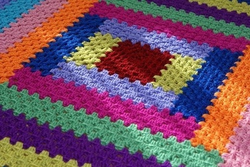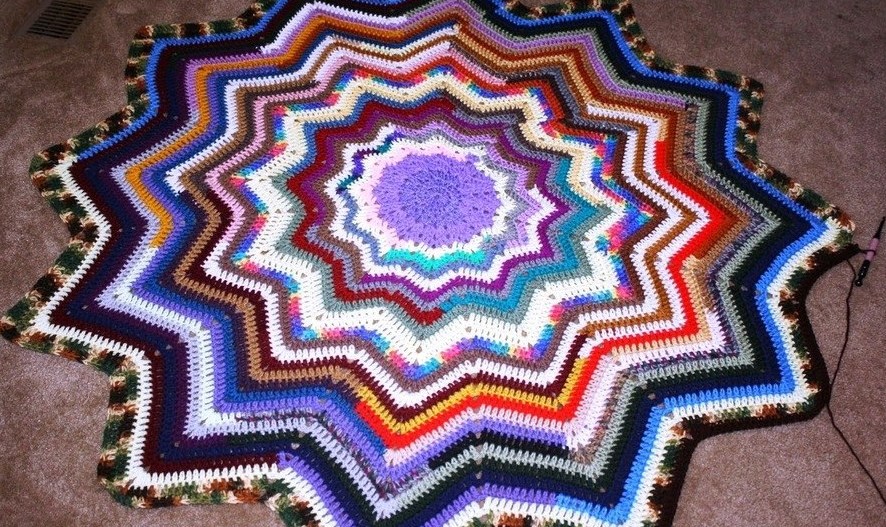 Ниже приведем схему для создания коврика узором «Зиг-заг» диаметром 112 см. от внешнего угла к внешнему углу противоположной стороны. Рекомендуем использовать крючок 7мм и 6 нитей разного цвета, но одинакового материала и фирмы.